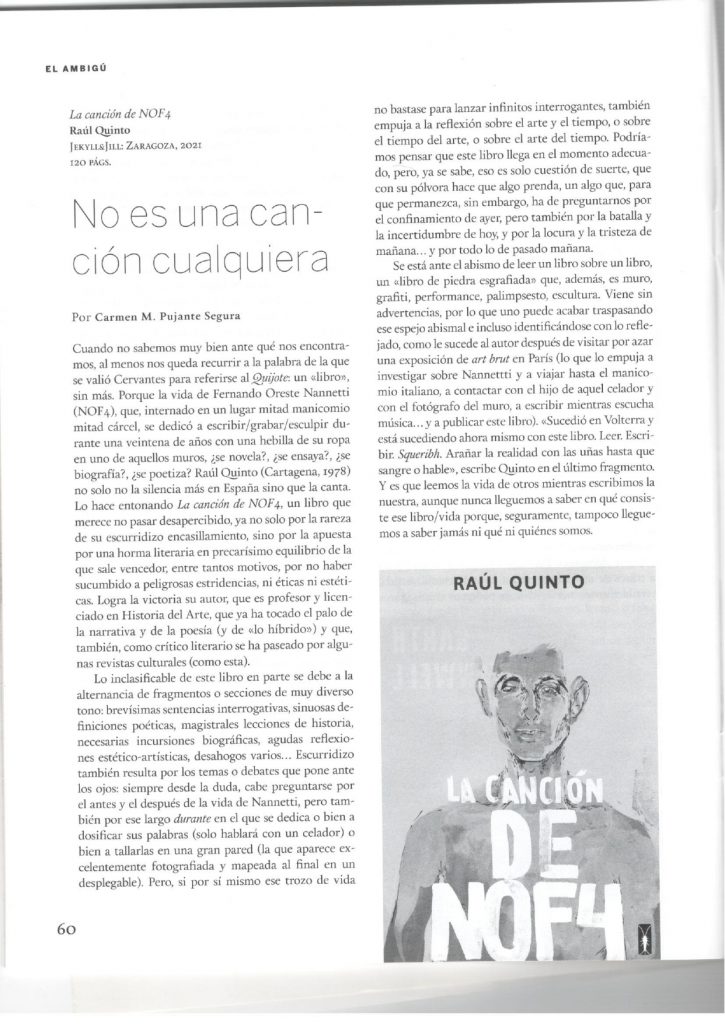 Y en el número 462 de la revista Quimera, publicado en este junio que está llegando a su fin, ve la luz mi reseña a La canción de NOF4 de Raúl Quinto.