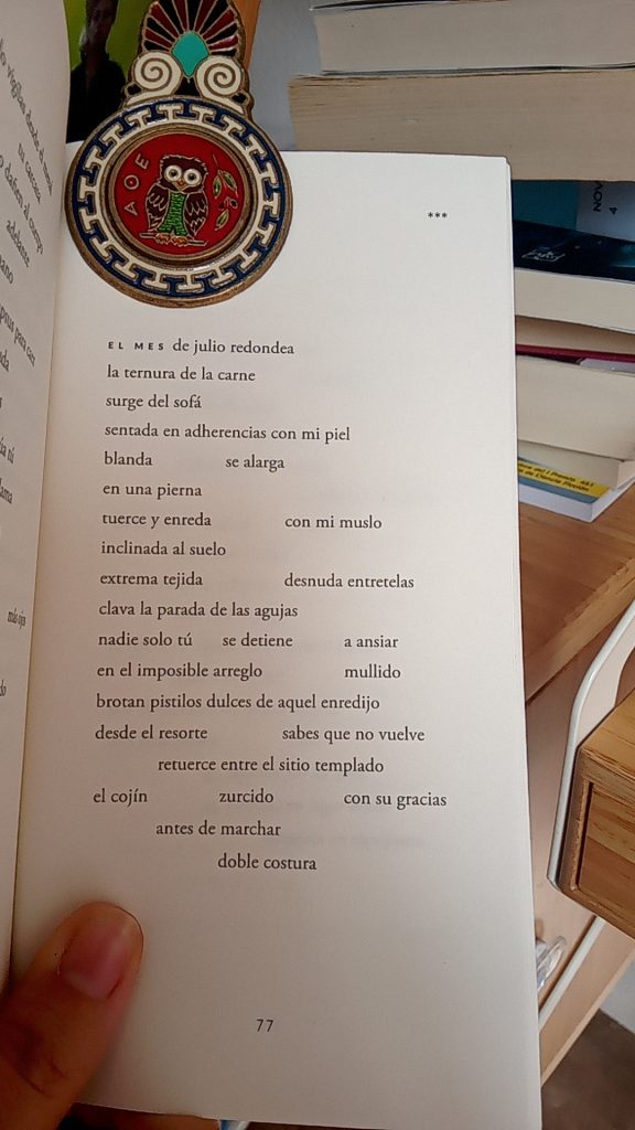 Violeta Nicolás me ha regalado su último libro, Hielo con espinas (Madrid, Franz, 2022), un título que, casualmente, retrata este mes de julio en el que se alterna el hielo para bajar estos calores y para aliviar las espinas del frenético trabajo universitario de fin de curso. El título de este libro de poesía encaja en el contexto académico y personal, sino que también uno de los poemas albergados es una oda al mes de julio y a los juegos fríos y calientes. Ya que una de las señas de identidad literaria de la autora consiste en sacarle partido al juego tipográfico en beneficio de su mensaje poético, se reproducirá el poema así:
